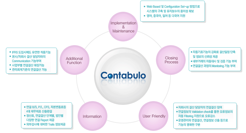 Contabulo는 본사와 자회사의 연결정보 추출 및 interface, 연결정보관리 DB(Consolidation Financial Data Warehouse), 내부거래 대사와 검증시스템 및 연결결산시스템으로 구성되어 한국의 기업회계기준(2011년부터는 IFRS를 한국기업회계기준으로 적용)울 적용하여 회사별 또는 Business portfolio(사업부)별 연결재무정보를 산출할 수 있으며, 해외 증권시장에 상장되어 있는 경우에는 Compliance를 위하여 요구되는 회계기준(IFRS 또는 미국회계기준 US GAAP)를 적용하여 회사별 사업부별 연결재무제표를 산출할 수 있습니다.